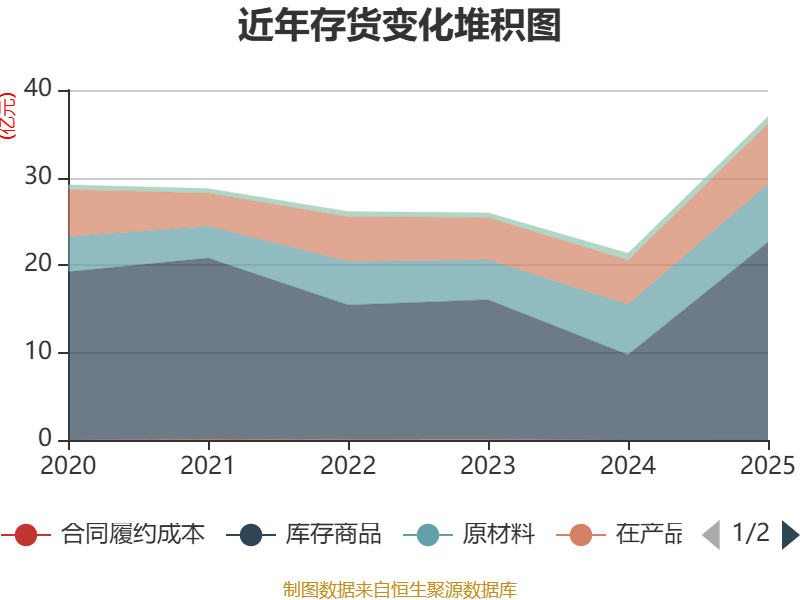 从存货变动来看,截止2025年末,公司存货账面价值为36.98亿元,占净财富的46.7%,较上年末加多15.63亿元。其中,存货跌价准备为1.02亿元,计提比例为2.67%。