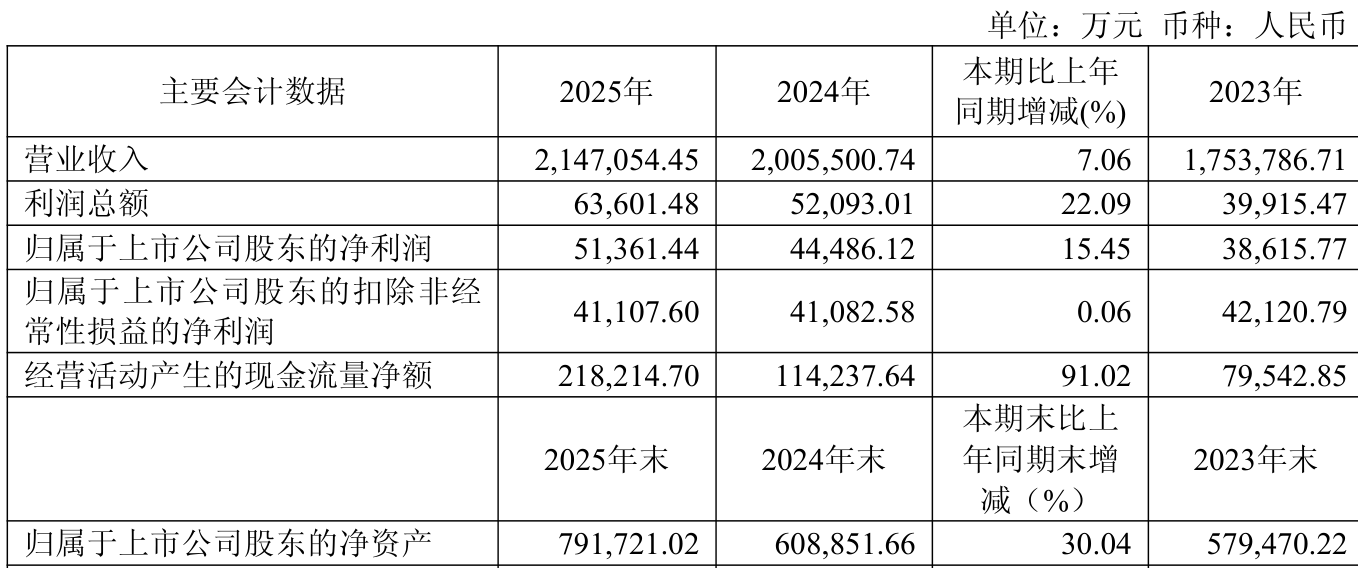 中证智能财讯期间新材(600458)3月28日走漏2025年年度叙述。2025年,公司结束买卖总收入214.71亿元,同比增长7.06%;归母净利润5.14亿元,同比增长15.45%;扣非净利润4.11亿元,同比增长0.06%;辩论步履产生的现款流量净额为21.82亿元,同比增长91.02%;叙述期内,期间新材基本每股收益为0.59元,加权平均净财富收益率为7.34%。公司2025年度分派预案为:拟向举座鼓动每10股派现1.62元(含税)。