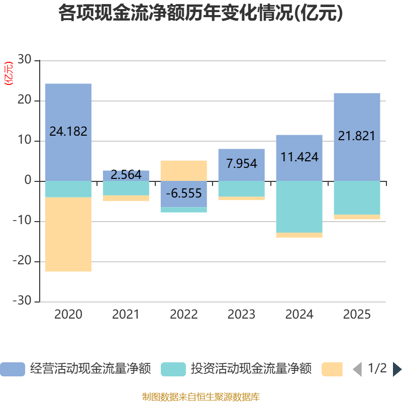 截止2025年,公司辩论步履现款流净额为21.82亿元,同比增长91.02%;筹资步履现款流净额-1.14亿元,同比加多1105.75万元;投资步履现款流净额-8.4亿元,上年同时为-12.87亿元。