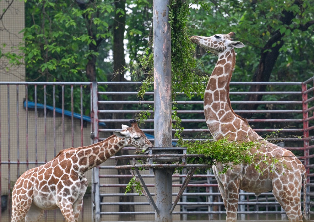 ▲重庆动物园,新引进的长颈鹿在“用餐”。记者 张锦辉 摄/视觉重庆