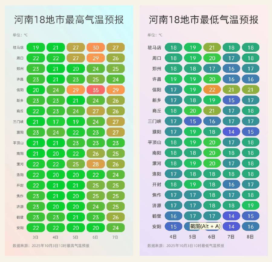 将来三天天气预告开首:河南省兴隆台2025年10月3日12时预告今宇宙午,三门峡南部、洛阳南部、平顶山、许昌、漯河、周口、南阳、驻马店、信阳阴天,有小雨或稀罕小雨,其中南阳部分县 (市、区)有中雨;其他县(市、区)多云。今天夜里,沿黄及以南阴天间多云,有小雨或稀罕小雨;其他县(市、区)多云。今天夜里,北中部局地有雾。翌日,全省阴天,淮河以北大部有小雨,其中西部、北中部部分县(市、区)有中到大雨。5日,全省阴天,淮河以北大部有小雨,其中西部、北部部分县(市、区)有中到大雨。6日,中西部、北部阴天有小雨或稀罕小雨,其他县(市、区)多云。5昼夜里到6日,全省偏北风3到4级,北中部阵风6级傍边。省会郑州今宇宙午:多云,夜里:阴天转小雨。偏北风2到3级。最高气温:22到23℃。最低气温:16到17℃。翌日,阴天有中雨,局部大雨。5日,阴天有小雨。6日,小雨转多云。举报/反映